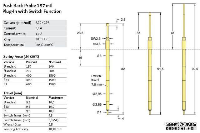 push back針具有很強(qiáng)大的彈力能夠直接接觸并反推待檢物體和結(jié)合機(jī)械機(jī)構(gòu)進(jìn)行連接測(cè)試;一旦待檢物體安裝正確,就能夠承受并壓制住此針,這種壓力能夠開啟這種開關(guān)的功能,該功能通過探針(內(nèi)置開關(guān)),或者針套亦或在下層安裝的一個(gè)接觸探針來實(shí)現(xiàn)。