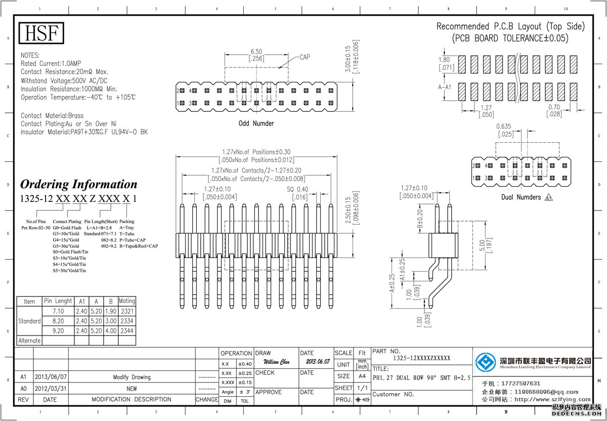產(chǎn)品分類:排針連接器 產(chǎn)品規(guī)格:聯(lián)豐盈 1.27MM 單層雙排 90貼片式(Type A) 排針 產(chǎn)品介紹:額定電流:1.0amp電流電阻:20m最大絕緣電阻:1000m民承受電壓:AC 500V /分鐘工作溫度:40﹣℃+
