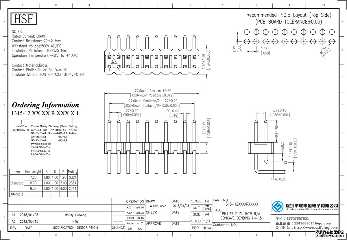 產(chǎn)品分類:排針連接器 產(chǎn)品規(guī)格:聯(lián)豐盈 1.27MM 雙排 90 DIP 排針 產(chǎn)品介紹:額定電流:1.0amp電流電阻:20m最大絕緣電阻:1000m民承受電壓:AC 500V /分鐘工作溫度:40﹣℃+ 105℃接觸材料: