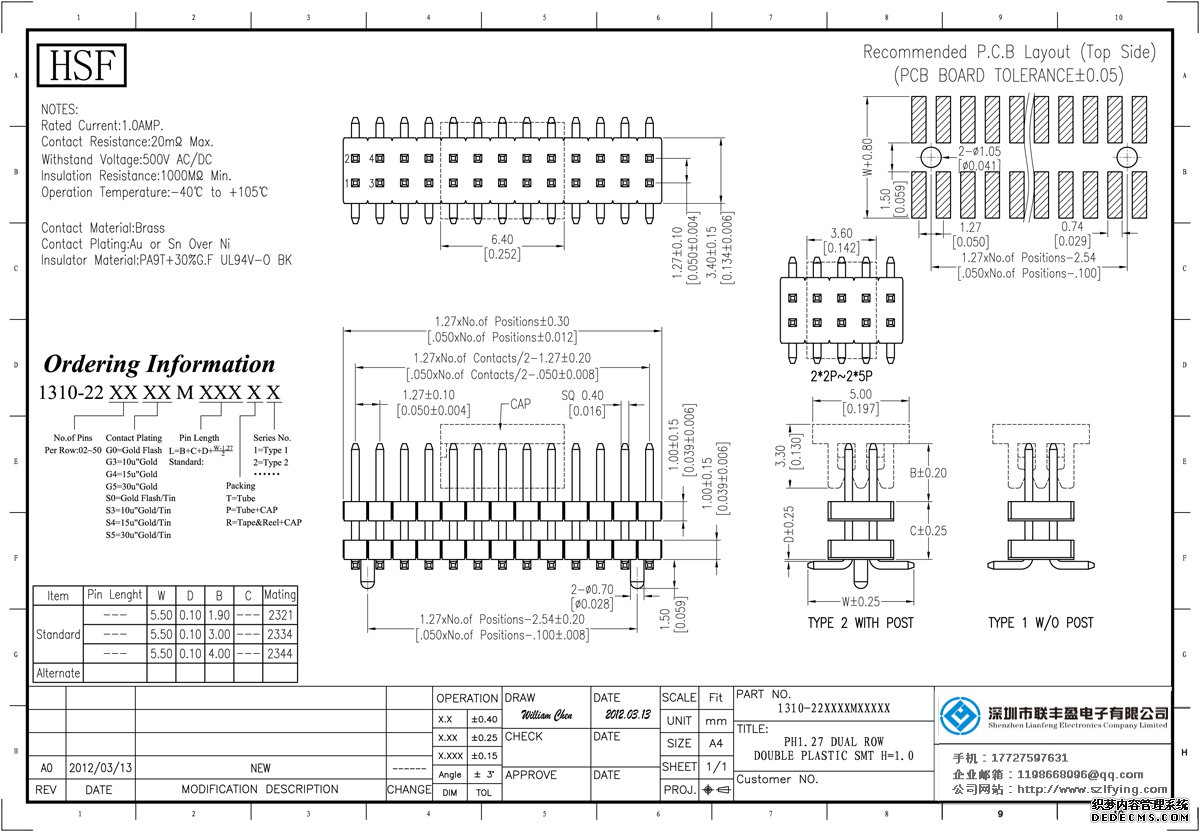產品分類:排針連接器 產品規(guī)格:聯(lián)豐盈 1.27MM 雙排雙塑 管裝加夾持蓋 排針 產品介紹:額定電流:1.0amp電流電阻:20m最大絕緣電阻:1000m民承受電壓:AC 500V /分鐘工作溫度:40﹣℃+