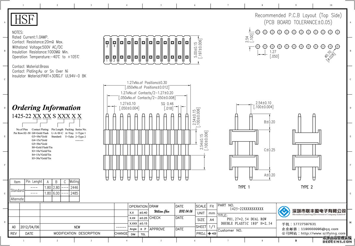 所屬分類(lèi):排針連接器 產(chǎn)品規(guī)格:1.27*2.54 雙層雙排 直針 排針 聯(lián)豐盈 技術(shù)參數(shù):額定電流:1.0amp電流電阻:20m最大絕緣電阻:1000m承受電壓:AC 500V /分鐘工作溫度:40﹣℃+ 105℃接觸材