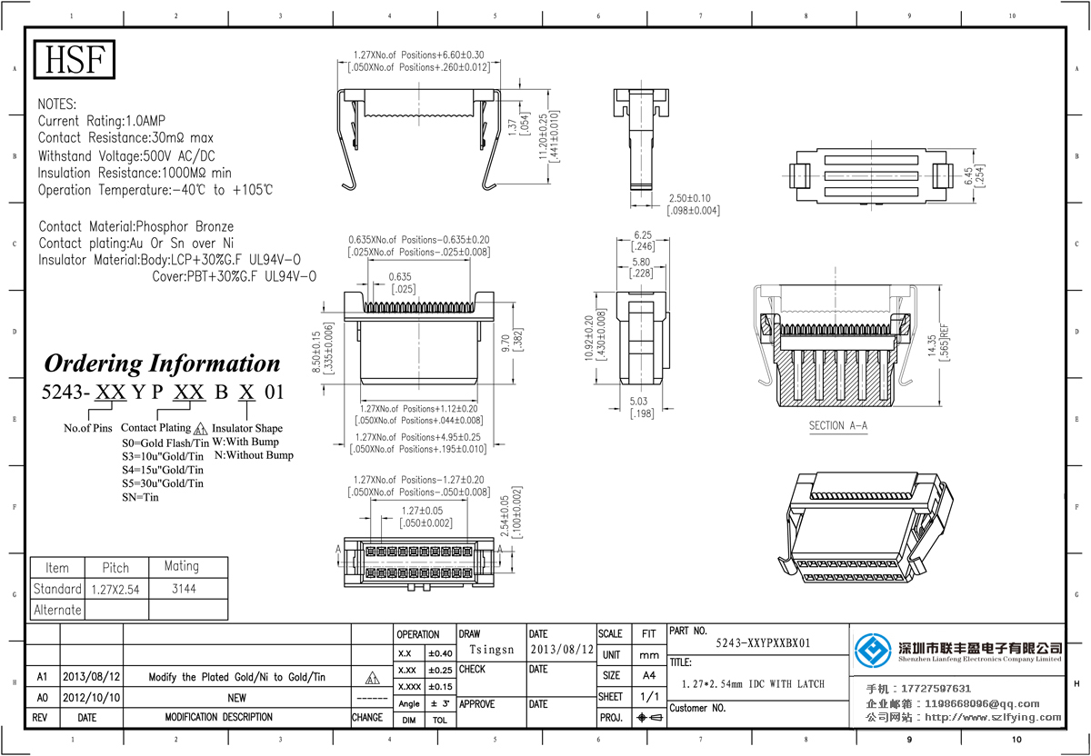 產品分類:IDC插座連接器 產品型號:1.27*2.54 TYCO 彈片型 IDC 聯(lián)豐盈 供應 技術參數:額定電流:1.0amp電流電阻:20m最大絕緣電阻:1000mmin耐壓:1000V AC /分鐘工作溫度:40﹣℃+ 105℃接觸材