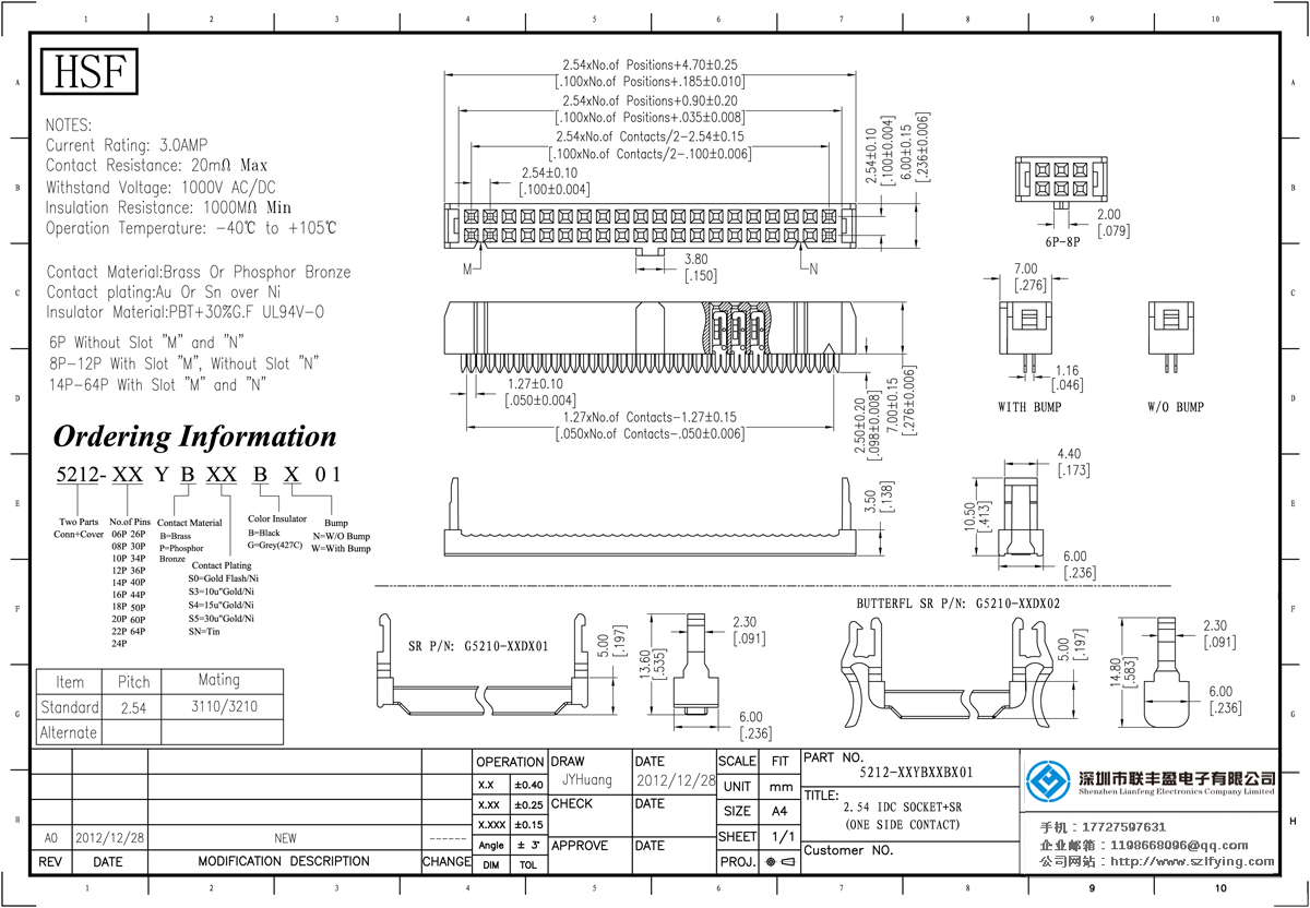 產(chǎn)品分類:IDC插座連接器 產(chǎn)品型號:2.54 彈片型 磷銅 帶凸點 IDC 聯(lián)豐盈 技術(shù)參數(shù):額定電流:3.0amp電流電阻:20m最大絕緣電阻:1000mmin耐壓:1000V AC /分鐘工作溫度:40﹣℃+ 105℃接觸材