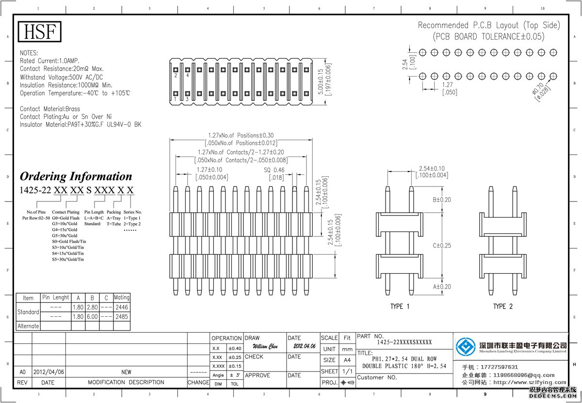 所屬分類:排針連接器 產(chǎn)品規(guī)格:1.27*2.54 雙排雙塑 直針 排針 廠家 技術(shù)參數(shù):額定電流:1.0amp電流電阻:20m最大絕緣電阻:1000m承受電壓:AC 500V /分鐘工作溫度:40﹣℃+ 105℃接觸材料