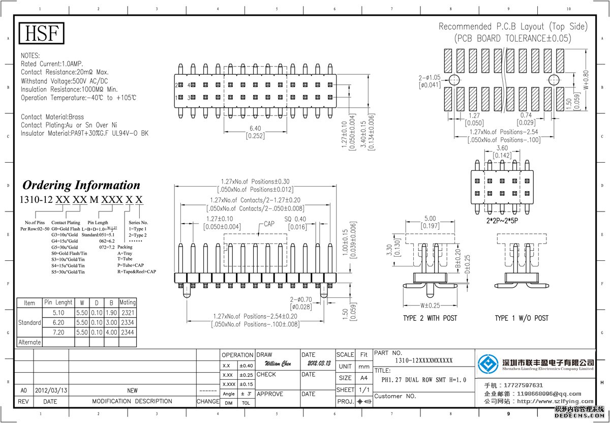 所屬分類:排針連接器 產(chǎn)品規(guī)格: 1.27MM 單層雙排 180 SMT 排針 技術(shù)參數(shù):額定電流:1.0amp電流電阻:20m最大絕緣電阻:1000m承受電壓:AC 500V /分鐘工作溫度:40﹣℃+ 105℃接觸材料:黃銅