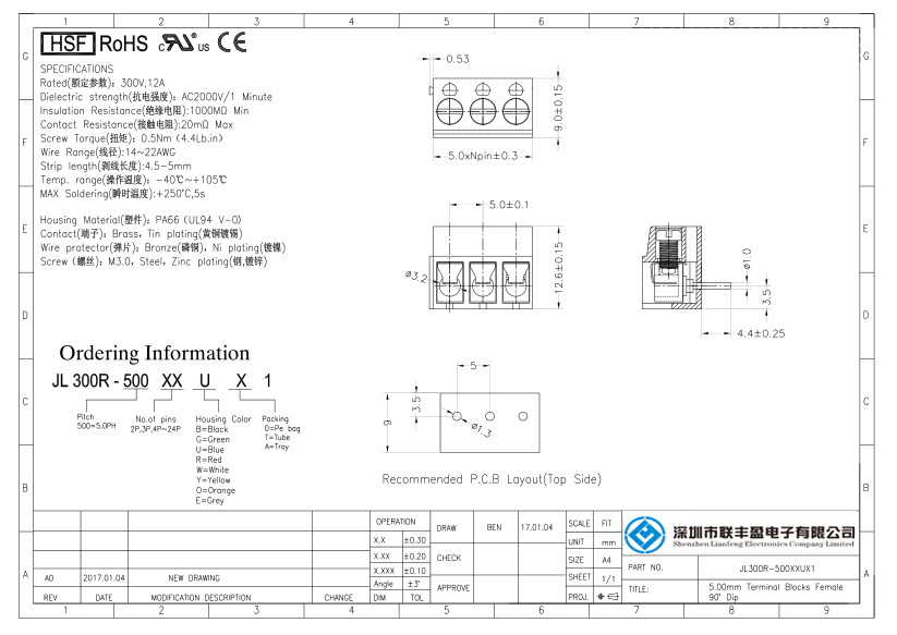 產(chǎn)品分類(lèi):接線端子 產(chǎn)品型號(hào):螺釘式PCB接線端子 間距5.00mm 詳細(xì)型號(hào):螺釘式PCB接線端子-JL300R,間距5.00mm,CE認(rèn)證,UL證書(shū) 產(chǎn)品介紹:材質(zhì)電鍍(MATERIAL) , 螺絲(Screw)M2.0,鋼,鍍鋅