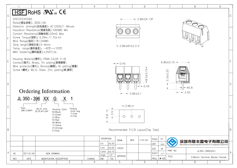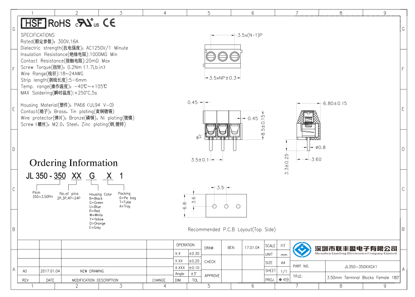 產(chǎn)品分類:接線端子 產(chǎn)品型號(hào):螺釘式PCB接線端子 間距3.50/3.96mm 詳細(xì)型號(hào):螺釘式PCB接線端子-JL350,間距3.50/3.96mm,CE認(rèn)證,UL證書 產(chǎn)品介紹:材質(zhì)電鍍(MATERIAL) , 螺絲(Screw)M2.0,鋼,