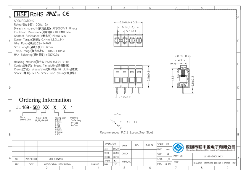 產(chǎn)品分類:接線端子 產(chǎn)品型號:螺釘式PCB接線端子 間距5.00mm 詳細(xì)型號:螺釘式PCB接線端子-JL169,間距5.00mm,CE認(rèn)證,UL證書 產(chǎn)品介紹:材質(zhì)電鍍(MATERIAL) , 螺絲(Screw)M2.0,鋼,鍍鋅