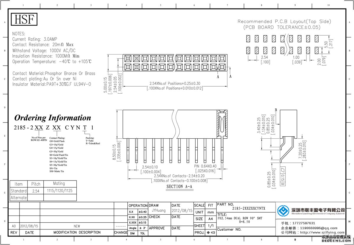 產(chǎn)品分類:排母連接器 產(chǎn)品規(guī)格:2.54MM H=7.1MM 上插式 2*7P 雙排 180 SMT 排母 聯(lián)豐盈 產(chǎn)品介紹:額定電流:3.0amp電流電阻:20m最大絕緣電阻:1000mmin耐壓:1000V AC /分鐘工作溫度:40﹣℃+