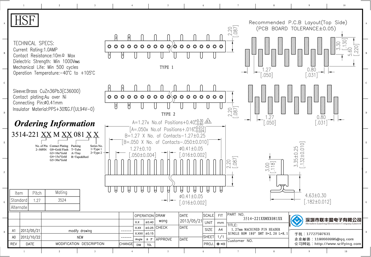 產(chǎn)品分類:圓孔排針排母連接器 產(chǎn)品型號:聯(lián)豐盈 1.27MM H=2.2 180 SMT 圓型排針 廠家 技術(shù)參數(shù):額定電流:1.0amp接觸電阻:10m0 Max Dielectric強(qiáng)度:MIN 500vrm5機(jī)械壽命:最少500次交配銷:0.38