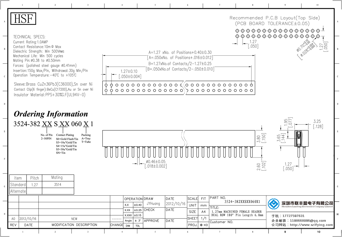 產(chǎn)品分類:圓孔排針排母連接器 產(chǎn)品型號:聯(lián)豐盈1.27MM 雙排 圓孔排母 技術(shù)參數(shù):額定電流:1.0amp接觸電阻:10m0 Max Dielectric強度:MIN 500vrm5機械壽命:最少500次交配銷:0.380.50mm力量:(