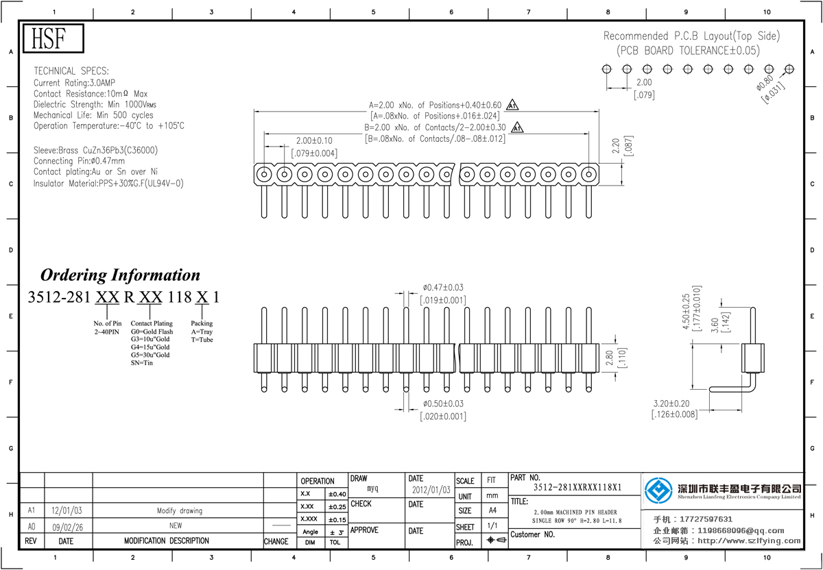 產(chǎn)品分類:圓孔排針排母連接器 產(chǎn)品型號:聯(lián)豐盈 2.0MM 單排 H=2.8 S/T 圓型排針 技術(shù)參數(shù):3.oamp接觸電阻:10mMax Dielectric強度:MIN1000vrms機械壽命:500分鐘周期運行溫度:40℃+ 105℃套:黃