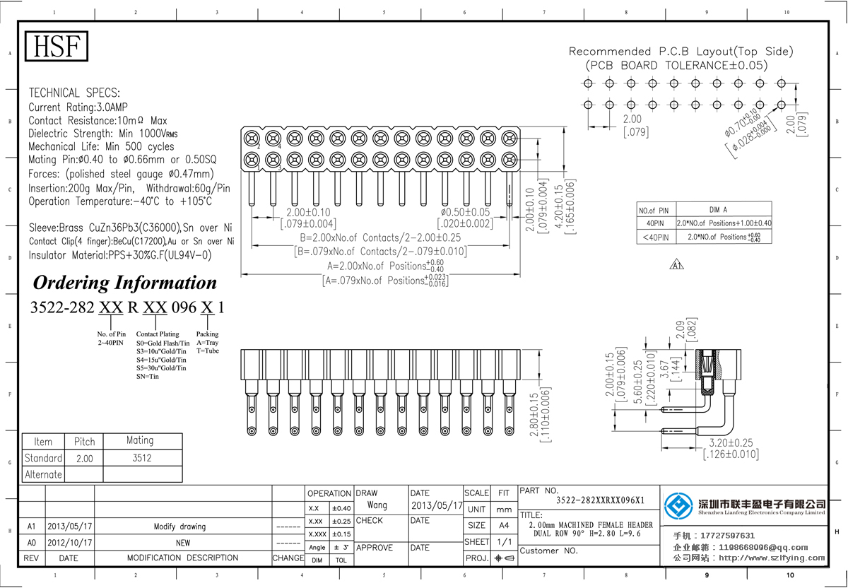 產(chǎn)品分類:圓孔排針排母連接器 產(chǎn)品型號:聯(lián)豐盈 2.0MM 雙排 R/A 圓孔排母 技術(shù)參數(shù):額定電流:3.oamp接觸電阻:1om最大介電強(qiáng)度:MIN 1000vrms機(jī)械壽命:最少500次交配引腳:0.400.66mm或0.