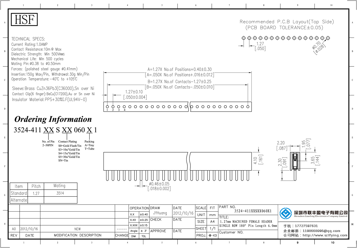 產(chǎn)品分類:圓孔排針排母連接器 產(chǎn)品型號:1.27MM間距 直插型 針長=6.0 技術(shù)參數(shù):額定電流:1.0amp接觸電阻:10m0 Max Dielectric強(qiáng)度:500vrm5機(jī)械壽命:最少500次交配銷:0.380.50mm力量:(拋