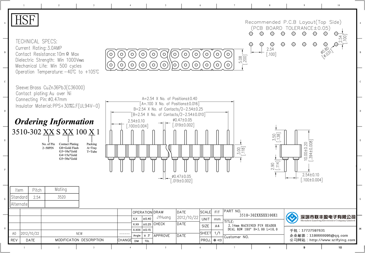 產(chǎn)品分類:圓孔排針排母連接器 產(chǎn)品型號:UL認證 2.54MM 雙排 H=3.0 S/T 圓型排針 聯(lián)豐盈 技術參數(shù):額定電流:3.oamp接觸電阻:1om最大介電強度:MIN 1000vrms機械壽命:最少500次交配銷:0.