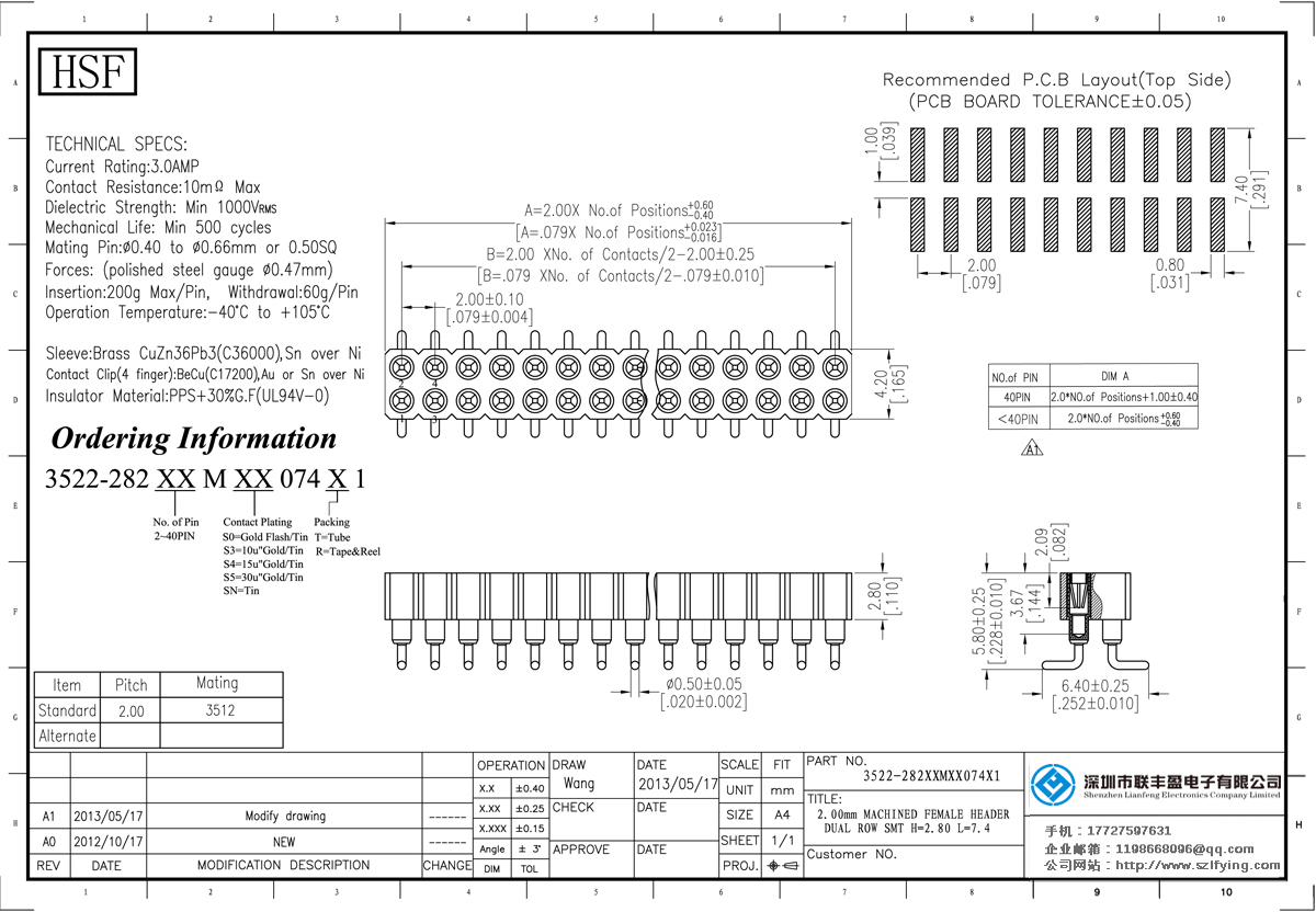 產(chǎn)品分類:圓孔排針排母連接器 產(chǎn)品型號:2.0MM 雙排 180 SMT 圓孔排母聯(lián)豐盈 技術(shù)參數(shù):額定電流:3.oamp接觸電阻:1om最大介電強度:MIN 1000vrms機械壽命:最少500次交配銷:0.400.66mm力量: