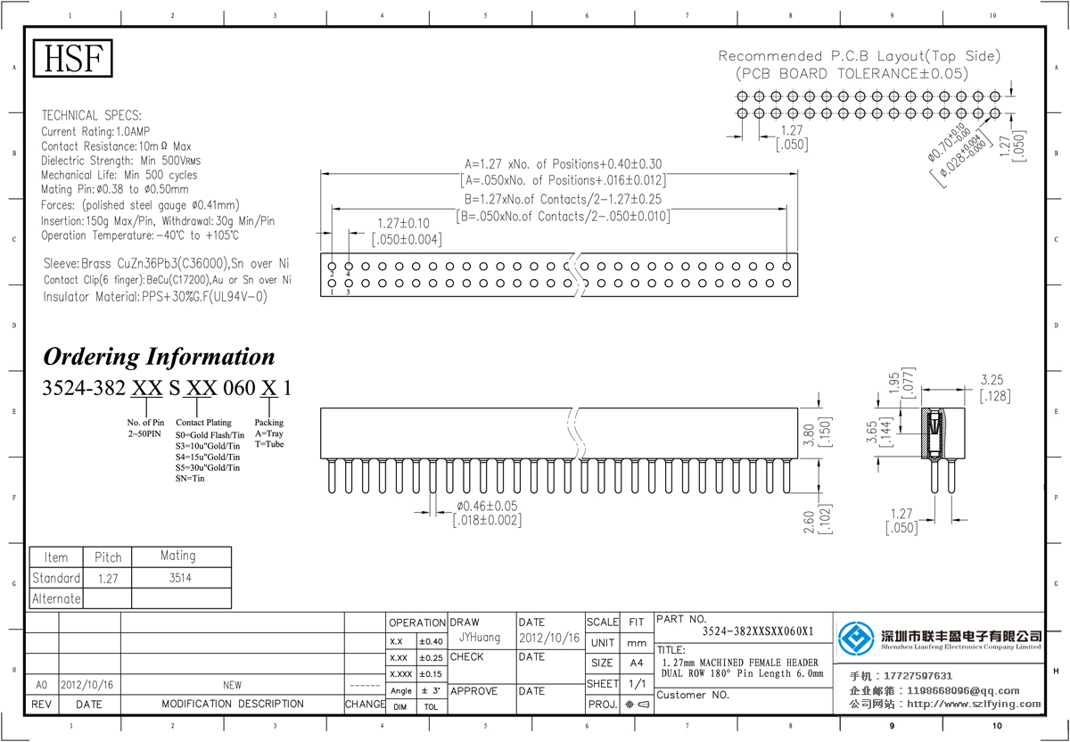 產(chǎn)品分類:圓孔排針排母連接器 產(chǎn)品型號(hào):聯(lián)豐盈 1.27MM 雙排 圓孔排母 廠家 技術(shù)參數(shù):額定電流:1.0amp接觸電阻:10m0 Max Dielectric強(qiáng)度:MIN 500vrm5機(jī)械壽命:最少500次交配銷:0.380.50mm力