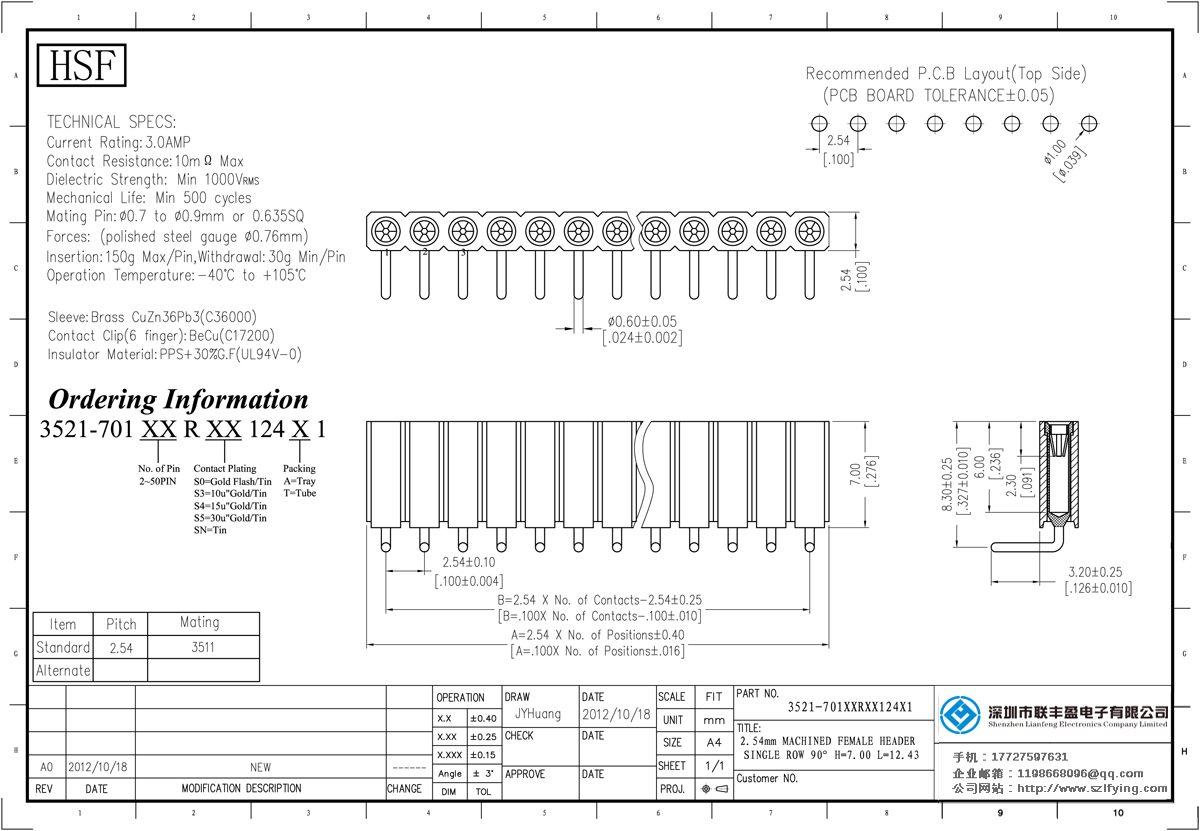 產(chǎn)品分類:圓孔排針排母連接器 產(chǎn)品型號(hào):聯(lián)豐盈 2.54MM 單排 H=7.0 90度彎插 圓孔排母 技術(shù)參數(shù):額定電流:3.oamp接觸電阻:1om最大介電強(qiáng)度:MIN 1000vrms機(jī)械壽命:最少500次交配引腳: