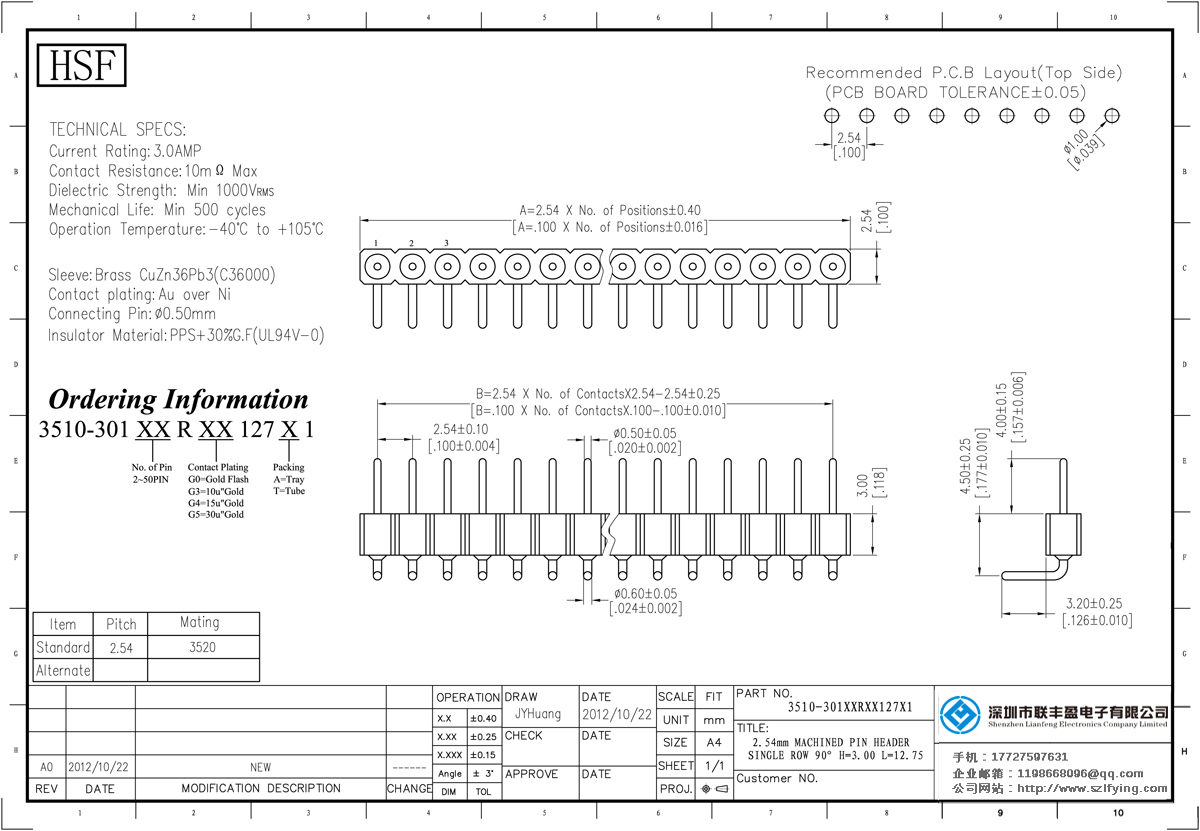 產(chǎn)品分類:圓孔排針排母連接器 產(chǎn)品型號(hào):聯(lián)豐盈 2.54MM 單排 H=3.0 R/A 圓型排針 技術(shù)參數(shù):額定電流:3.oamp接觸電阻:1om最大介電強(qiáng)度:MIN 1000vrms機(jī)械壽命:最少500次交配引腳:0.70.9mm或