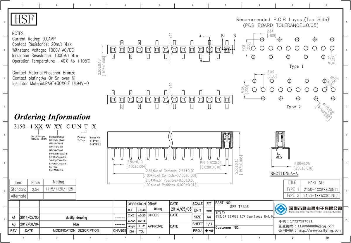 產(chǎn)品分類:排母連接器 產(chǎn)品規(guī)格:聯(lián)豐盈 2.54MM H=5.0MM 單排 蜈蚣腳 排母 批發(fā) 產(chǎn)品介紹:額定電流:3.0amp電流電阻:20m最大絕緣電阻:1000mmin耐壓:1000V AC /分鐘工作溫度:40﹣℃+ 105℃接