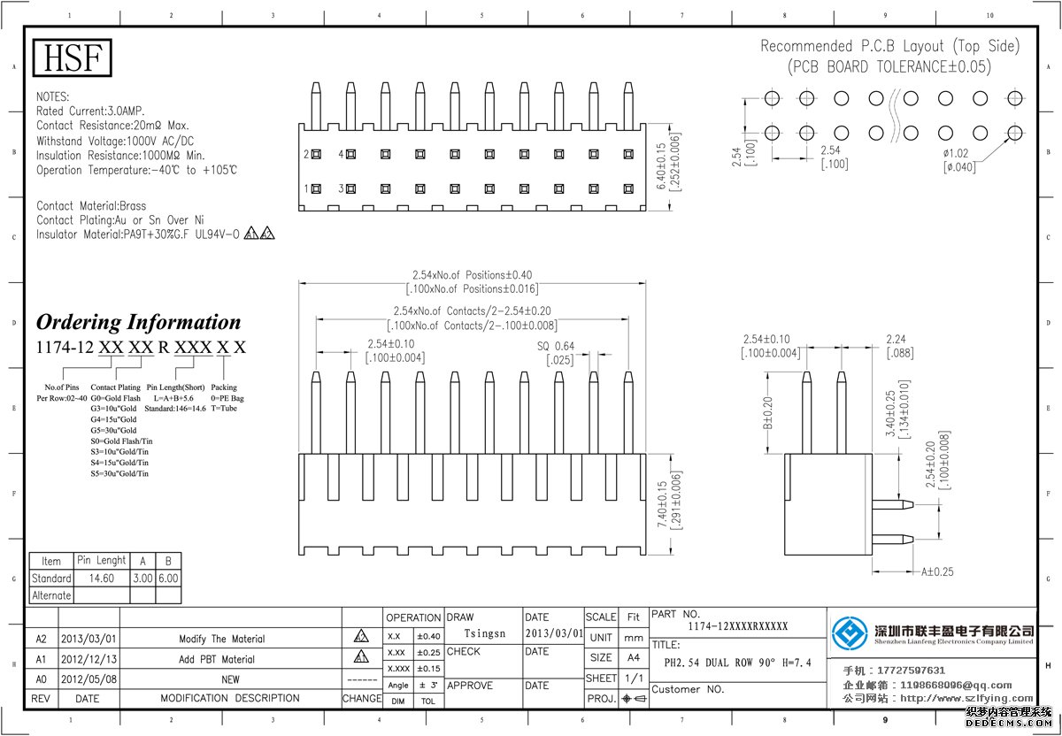 產(chǎn)品分類:排針連接器 產(chǎn)品規(guī)格: 2.54MM 單層雙排 選鍍半金 90DIP 排針 技術(shù)參數(shù):額定電流:3.0amp電流電阻:20m最大絕緣電阻:1000m承受電壓:AC 500V /分鐘工作溫度:40﹣℃+ 105℃接觸材