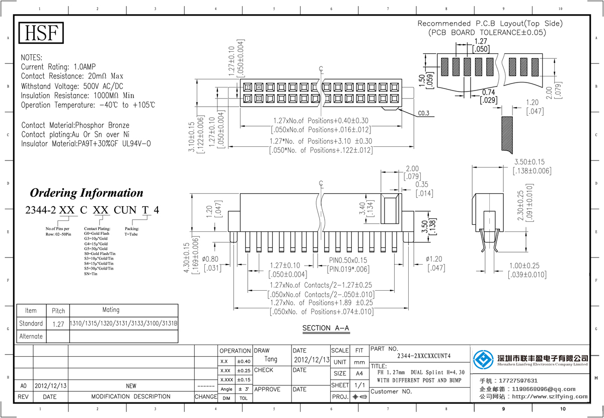 產(chǎn)品分類:排母連接器 產(chǎn)品規(guī)格:聯(lián)豐盈 UL認(rèn)證 1.27MM H=4.4MM 雙排 夾板式 排母 廠家直銷 產(chǎn)品介紹:額定電流:1.0amp電流電阻:20m最大絕緣電阻:1000m民承受電壓:AC 500V /分鐘工作溫度
