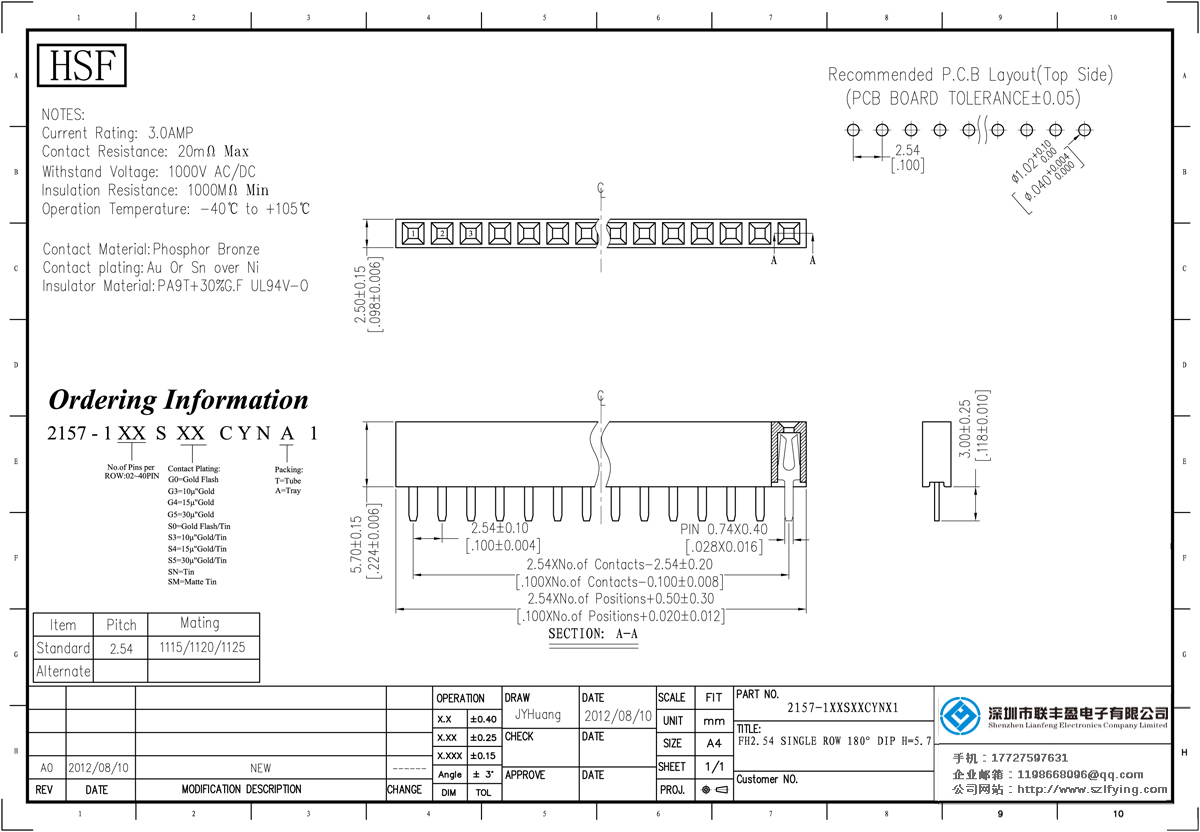產(chǎn)品分類:排母連接器 產(chǎn)品規(guī)格:2.54mm 母頭、單排、直腳 產(chǎn)品介紹:電流評級:3.0amp電流電阻:20m最大絕緣電阻值:1000m耐受電壓1000V AC /分鐘:分鐘操作溫度:﹣40℃to + 105℃:磷青銅