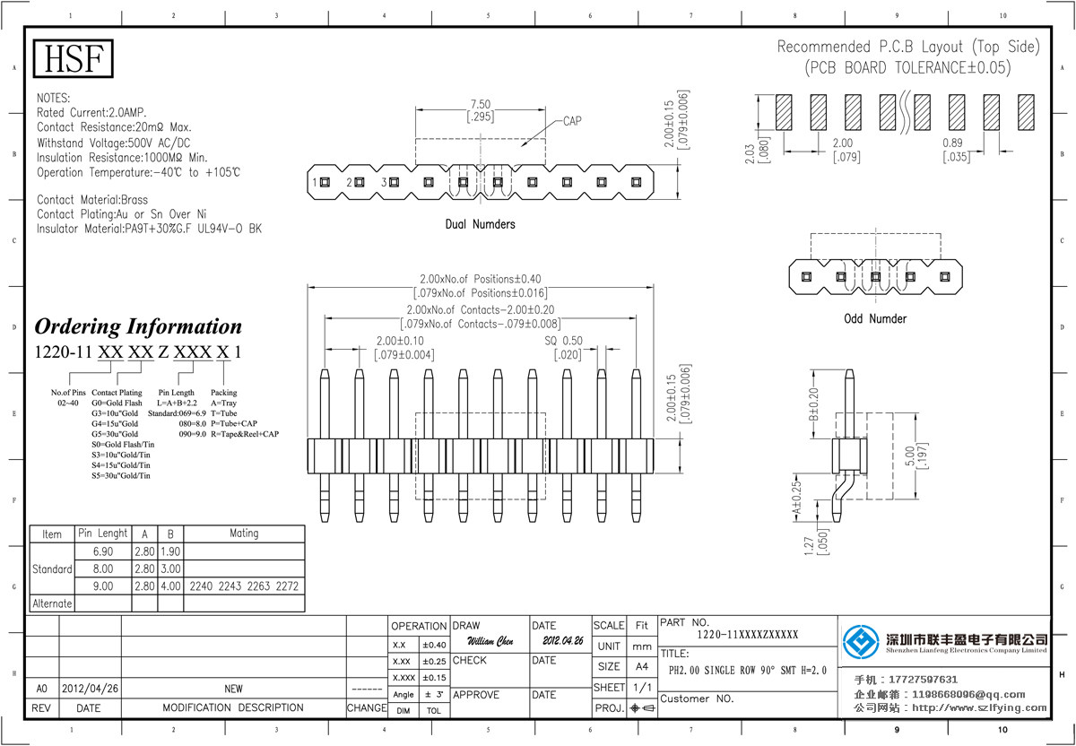 產(chǎn)品分類:排針連接器 產(chǎn)品規(guī)格:聯(lián)豐盈 2.0MM 單層單排 90SMT 排針 供應 產(chǎn)品介紹:額定電流:2.0amp電流電阻:20m最大絕緣電阻:1000m民承受電壓:AC 500V /分鐘工作溫度:40﹣℃+ 105℃接