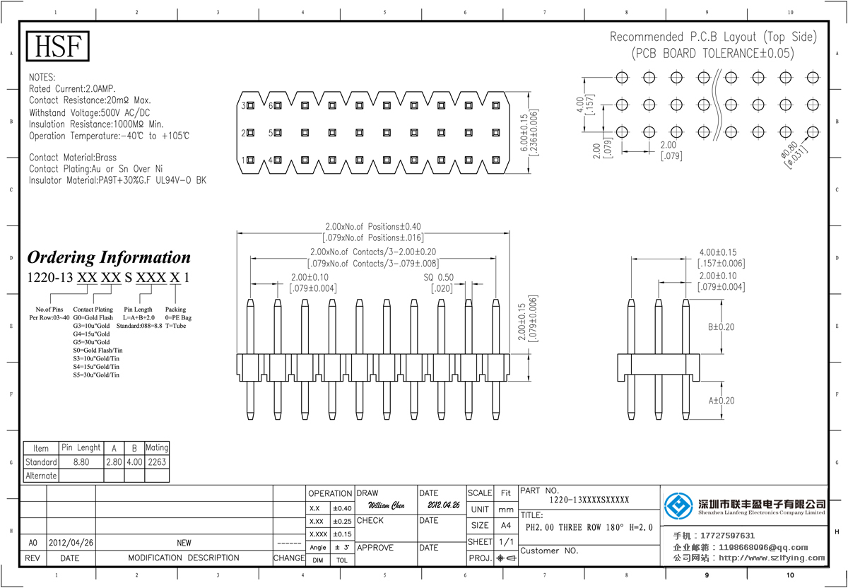 產(chǎn)品分類: 排針連接器 產(chǎn)品規(guī)格:2.0MM 單層三排 180DIP 排針 產(chǎn)品介紹:額定電流:2.0amp電流電阻:20m最大絕緣電阻:1000m民承受電壓:AC 500V /分鐘工作溫度:40﹣℃+ 105℃接觸材料:黃