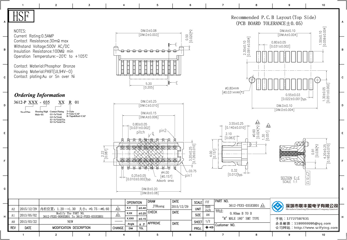產(chǎn)品分類:Board To Board 連接器 產(chǎn)品型號:0.8MM 公座 單槽結(jié)構(gòu) Board To Board聯(lián)豐盈 技術(shù)參數(shù):額定電流:0.5amp電流電阻:20m最大絕緣電阻:100m承受電壓:AC 500V /分鐘工作溫度:20﹣℃+ 1