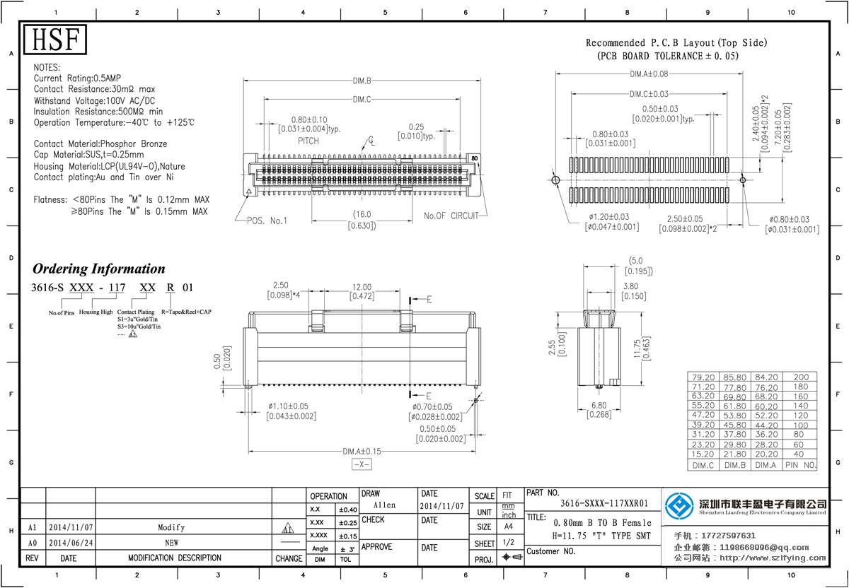 產(chǎn)品分類:Board To Board 連接器 產(chǎn)品型號(hào):0.8MM 80P 母頭 BTB T型 Board To Board聯(lián)豐盈 技術(shù)參數(shù):額定電流:0.5amp電流電阻:30m最大絕緣電阻:100m承受電壓:AC 500V /分鐘工作溫度:40﹣℃+ 1