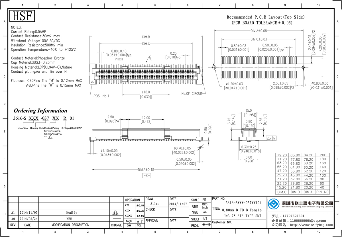 產品分類:Board To Board 連接器 產品型號:0.8MM 母頭 BTB T型 Board To Board 聯(lián)豐盈 技術參數(shù):額定電流:0.5amp電流電阻:30m最大絕緣電阻:100m承受電壓:AC 500V /分鐘工作溫度:40﹣℃+ 105℃