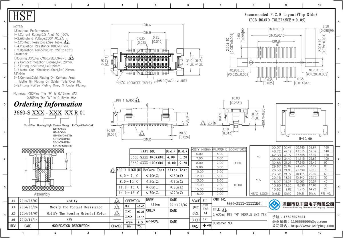 產(chǎn)品分類:Board To Board 連接器 產(chǎn)品型號:0.635MM 40P 母座 Board To Board 聯(lián)豐盈 技術(shù)參數(shù):額定電流:0.5amp電流電阻:60m最大絕緣電阻:100m承受電壓:AC 500V /分鐘工作溫度:40﹣℃+ 105℃接