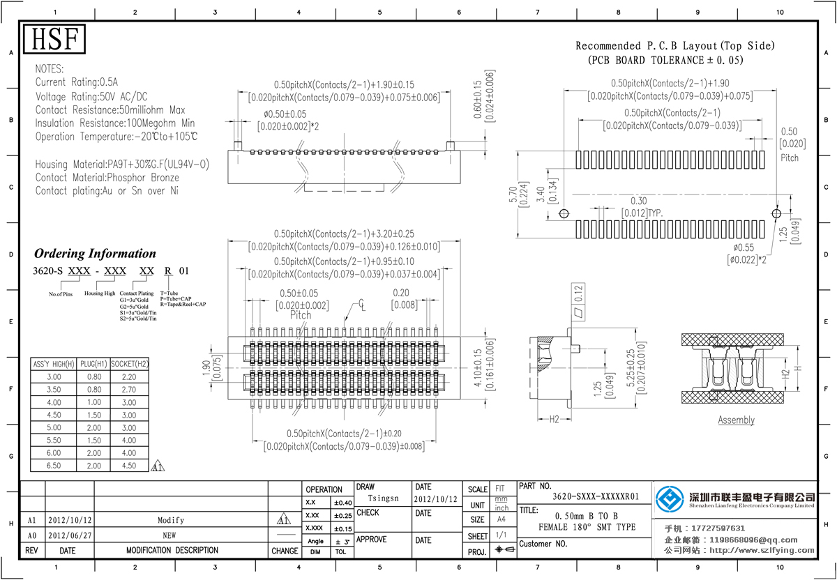 產品分類:Board To Board 連接器 產品型號:0.5MM 母座 雙槽結構 Board To Board 板對板 廠家 聯豐盈 技術參數:額定電流:0.5amp電流電阻:30m最大絕緣電阻:100mmin耐壓50V的交流/分鐘:操作溫