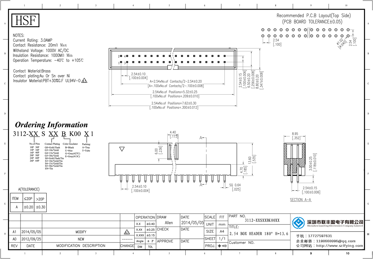 產(chǎn)品分類:簡易牛角連接器 產(chǎn)品型號:2.54MM H=13.6 散鍍?nèi)?滿PIN 180DIP 簡牛聯(lián)豐盈 技術(shù)參數(shù):額定電流:1.52amp接觸電阻:2om最大承受電壓:500V的交流/直流絕緣電阻:1000m毫米的操作溫
