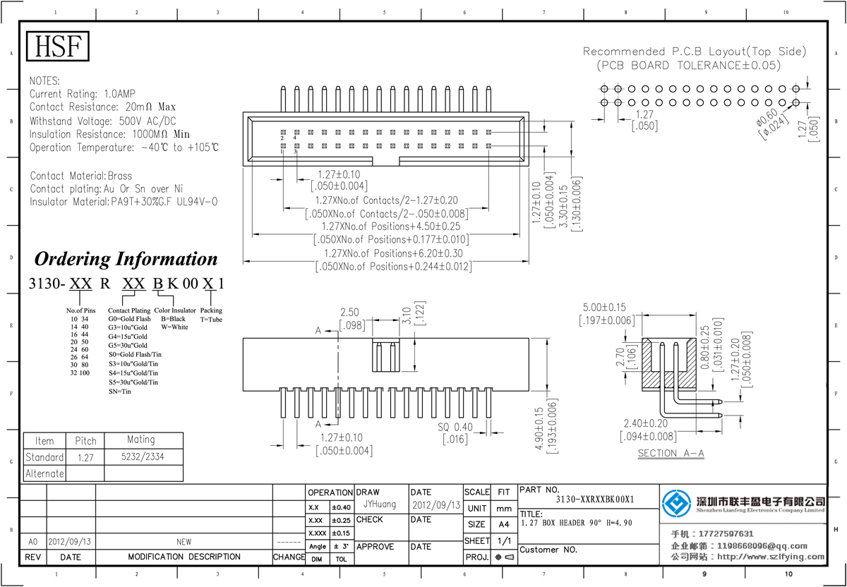 產(chǎn)品分類:簡(jiǎn)易牛角連接器 產(chǎn)品型號(hào):聯(lián)豐盈 抗氧化 1.27MM H=5.7 90DIP ,滿PIN 簡(jiǎn)牛 廠家 技術(shù)參數(shù):額定電流:1.0amp電流電阻:20m最大絕緣電阻:1000m民承受電壓:AC 500V /分鐘工作溫度: