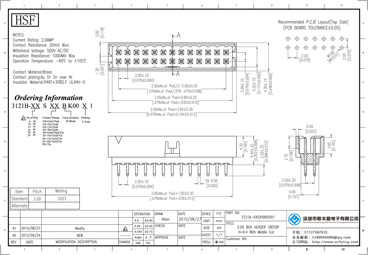 產(chǎn)品分類(lèi):簡(jiǎn)易牛角連接器 產(chǎn)品型號(hào):聯(lián)豐盈 2.0MM TYCO型 180DIP 簡(jiǎn)牛 技術(shù)參數(shù):額定電流:2.0amp電流電阻:20m最大承受電壓:500V的交流/直流絕緣電阻:1000分鐘操作溫度:40﹣℃+ 105℃接